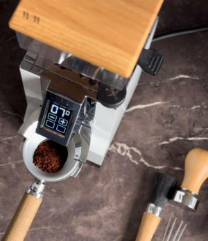 - Sillä Mahlkönig X54: Puinen kansi on räätälöity täydellisesti kompaktiin ja monipuoliseen X54-malliin, mikä antaa sille sekä esteettistä että toiminnallista ilmettä.