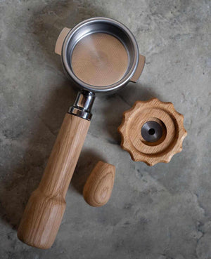 Kahvamme, jonka muotoilu on "Elegant", tulee alkuperäisistä portafilterpäistä ECM:ltä, kun taas kaikki muut portafilter ovat ruostumattomasta teräksestä valmistettuja portafilterpäitä. Jokaisena päivänä kahvamme tarjoaa poikkeuksellisen taktiilisen kokemuksen. Puumme käsitellään käsin orgaanisella kovapähkinäöljyllä, jotta puun luonnollinen tuntuma säilyy.