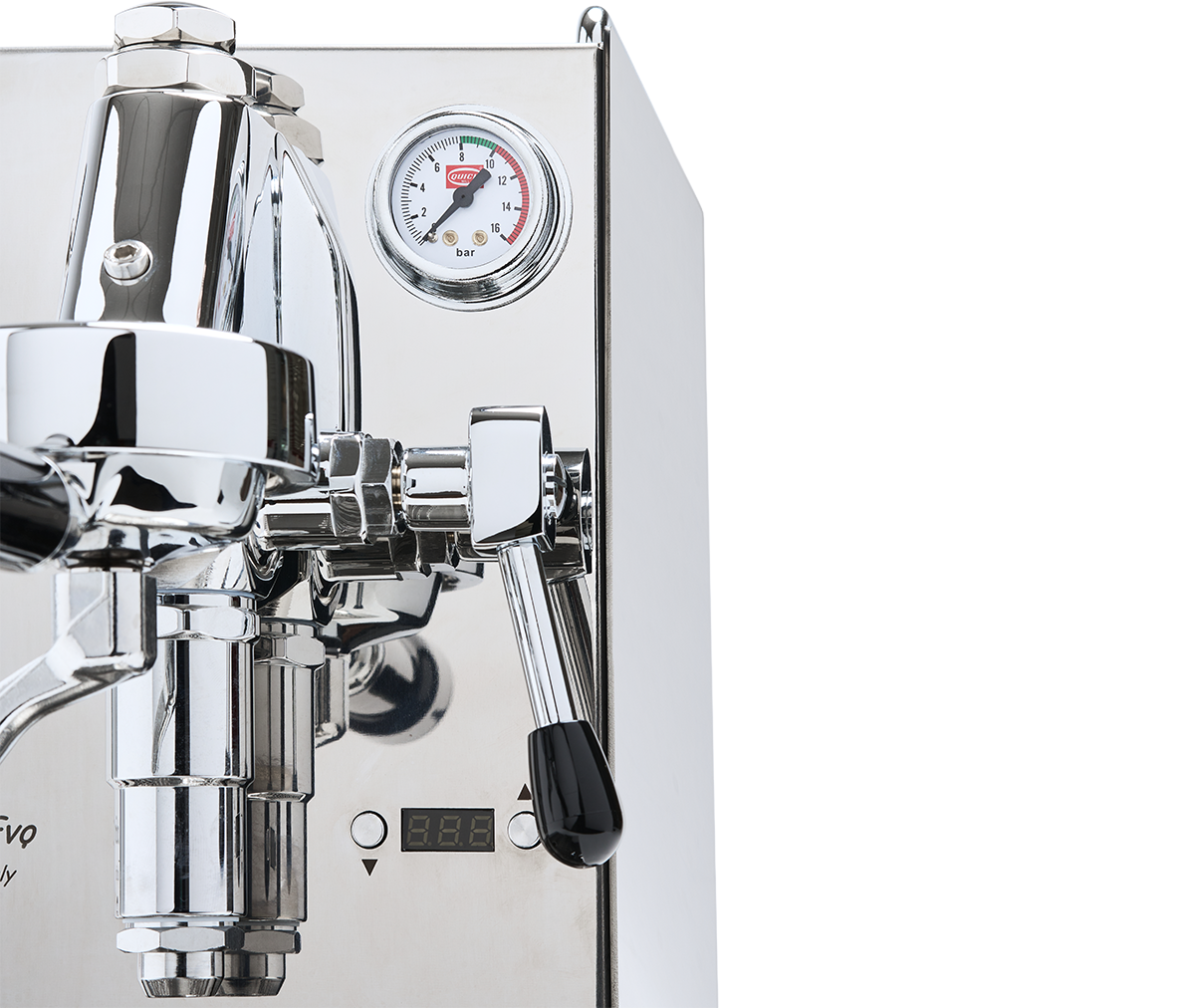 Integroitu näyttö näyttää lämpötilan, shot-ajastimen, vesitason ja asetukset. Painemittari (0–16 bar) ja klassiset vivut tekevät käytöstä intuitiivista ja tarkkaa.