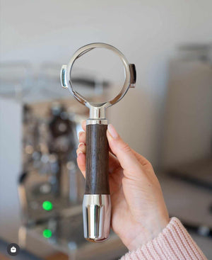 Kahvamme, jonka muotoilu on "Elegant", tulee alkuperäisistä portafilteripäistä ECM:ltä, kun taas kaikki muut portafilter sisältävät ruostumattomasta teräksestä valmistettuja portafilteripäitä. Jokaisena päivänä kahvamme tarjoaa poikkeuksellisen taktiilisen kokemuksen. Puumme käsitellään käsin orgaanisella kovapuuöljyllä, jotta puun luonnollinen tunne säilyy.