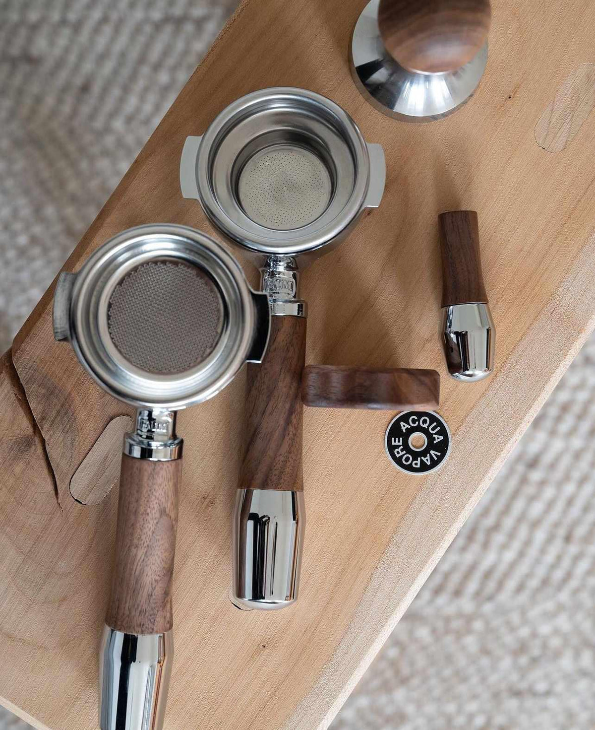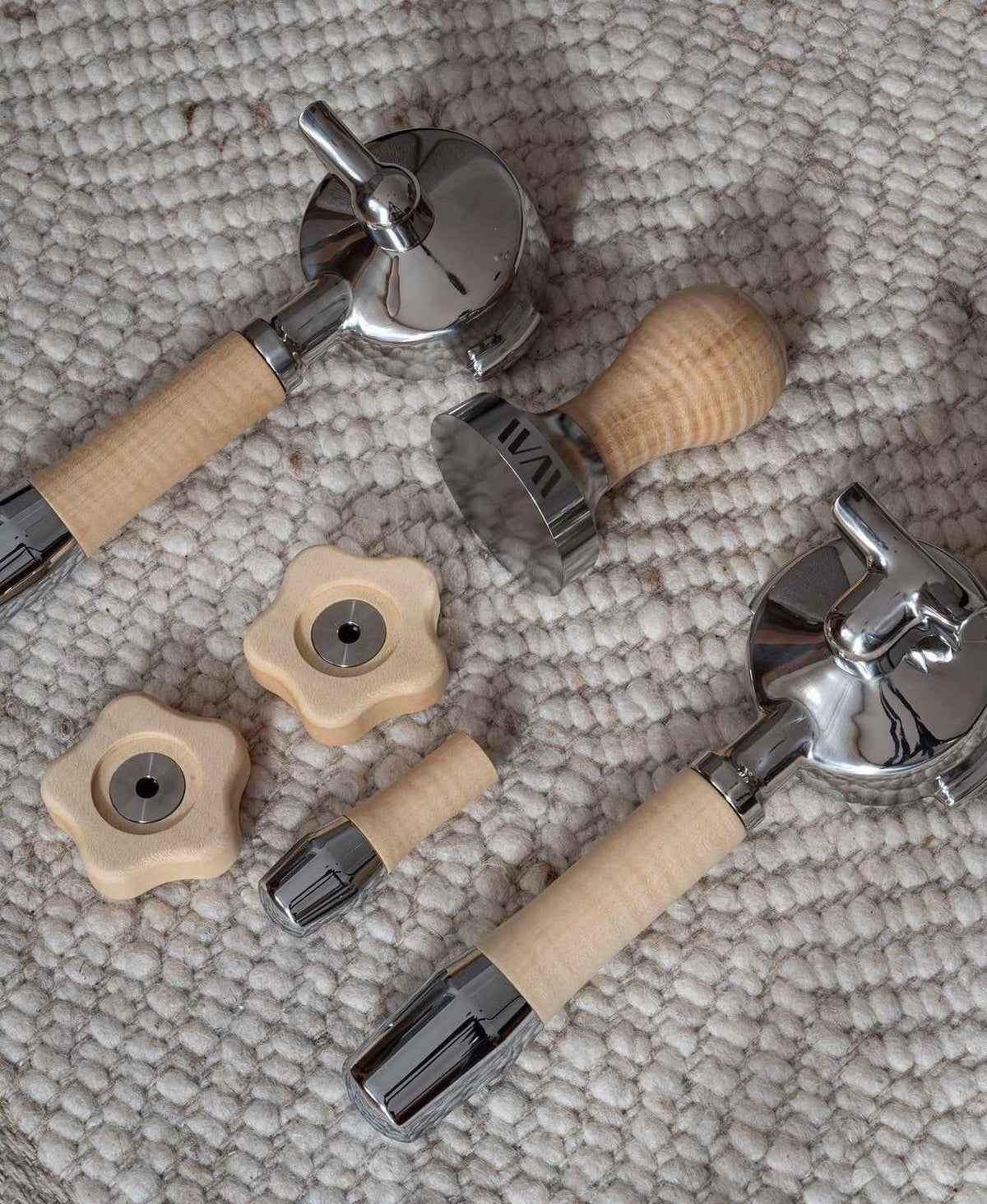 Elegantti-mallimme kahva toimitetaan alkuperäisillä ECM-portafilterin päillä, kun taas kaikissa muissa portafiltereissä on ruostumattomasta teräksestä valmistetut portafilterin päät. Kahvamme tarjoaa päivittäin ainutlaatuisen kosketuskokemuksen. Puumme käsitellään käsin orgaanisella kovalla öljyllä, jotta puun luonnollinen tuntuma säilyy.